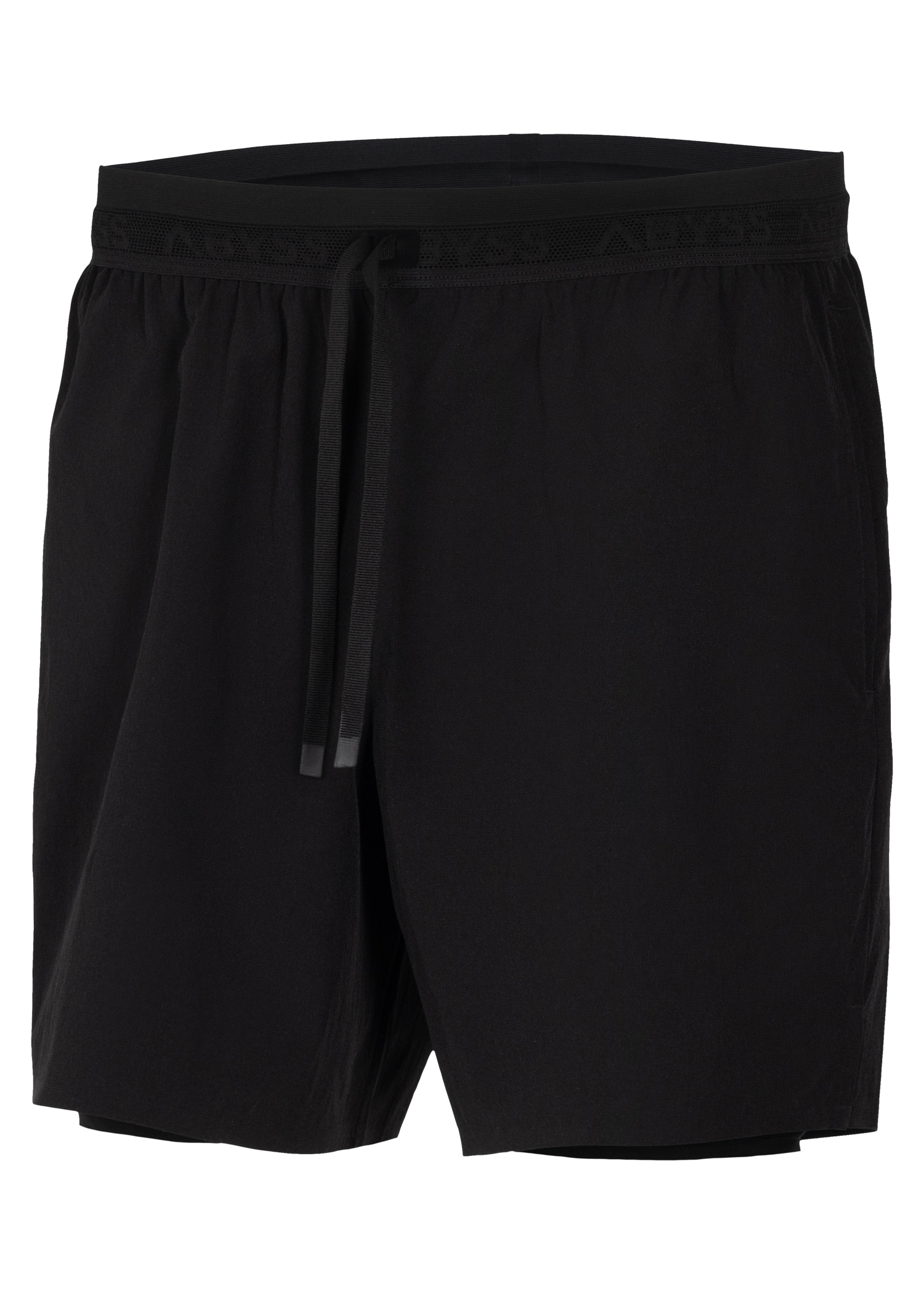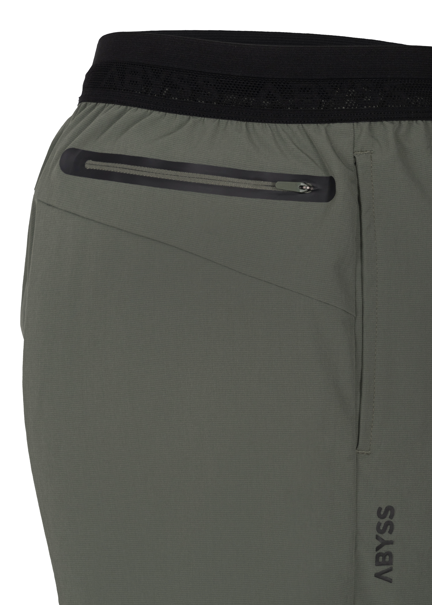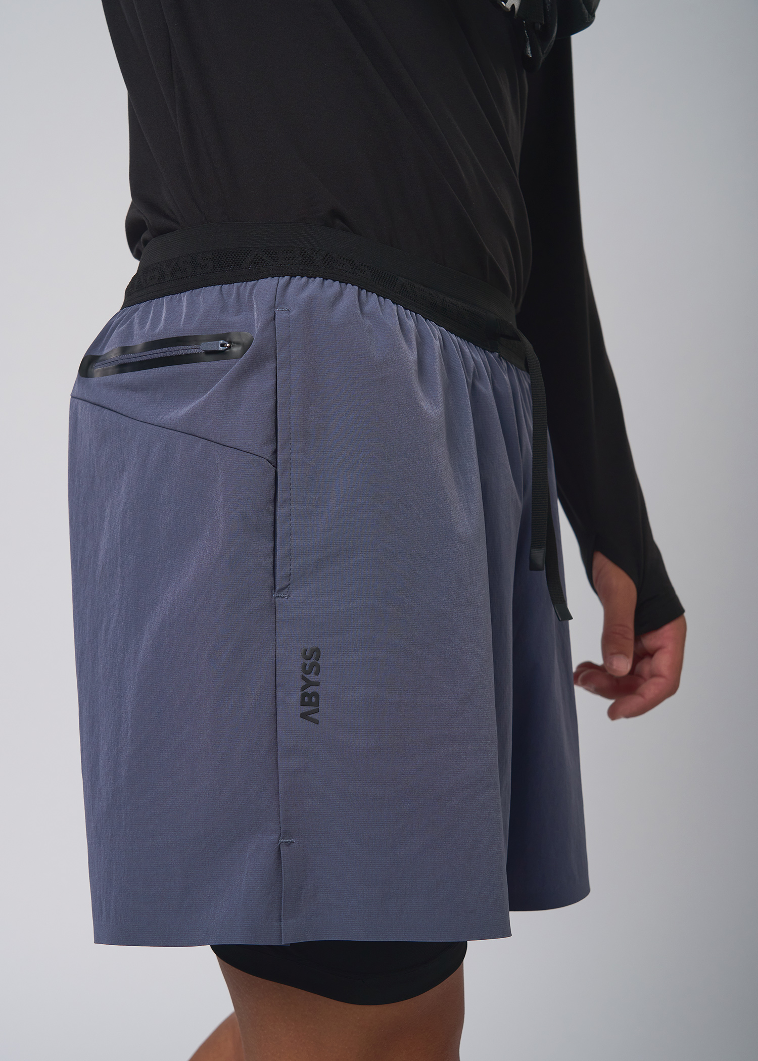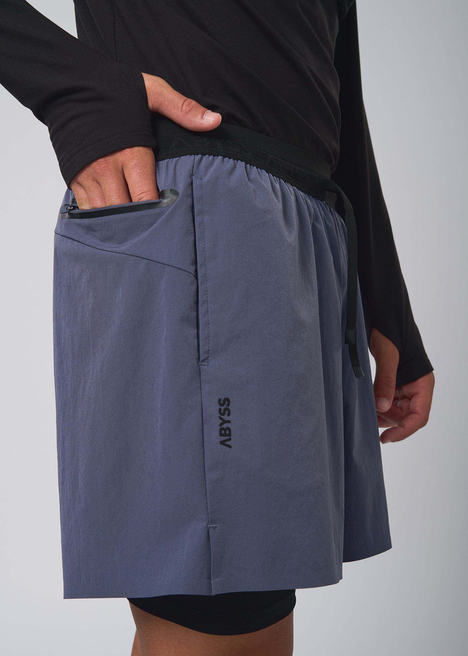 Nylon fantasia con spandex. Bermuda con elástico y cordón ajustable, bolsillos delanteros y trasero termosellado con cierre. Calza interna con silicona antideslizante en pierna. Logo termosellado.