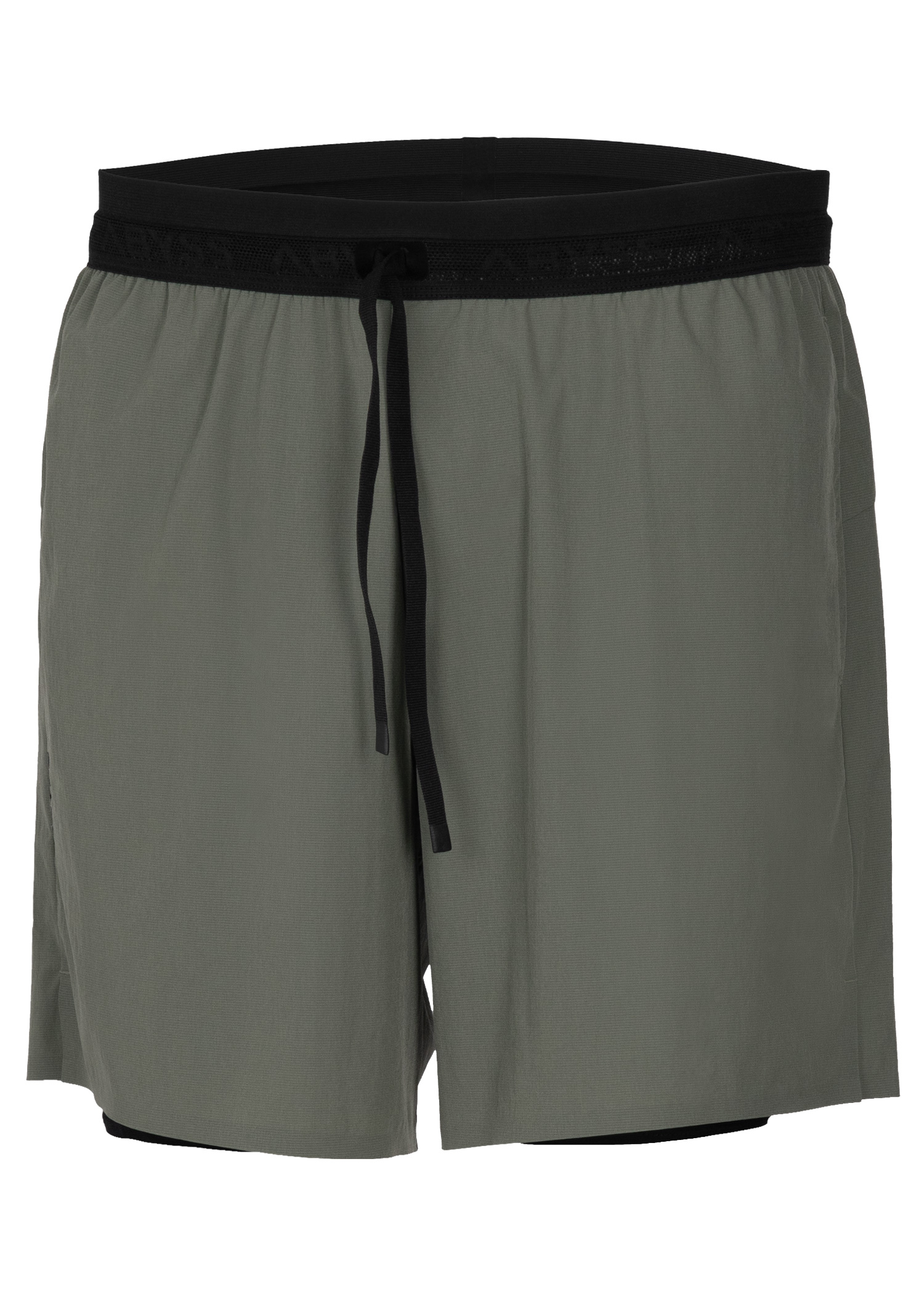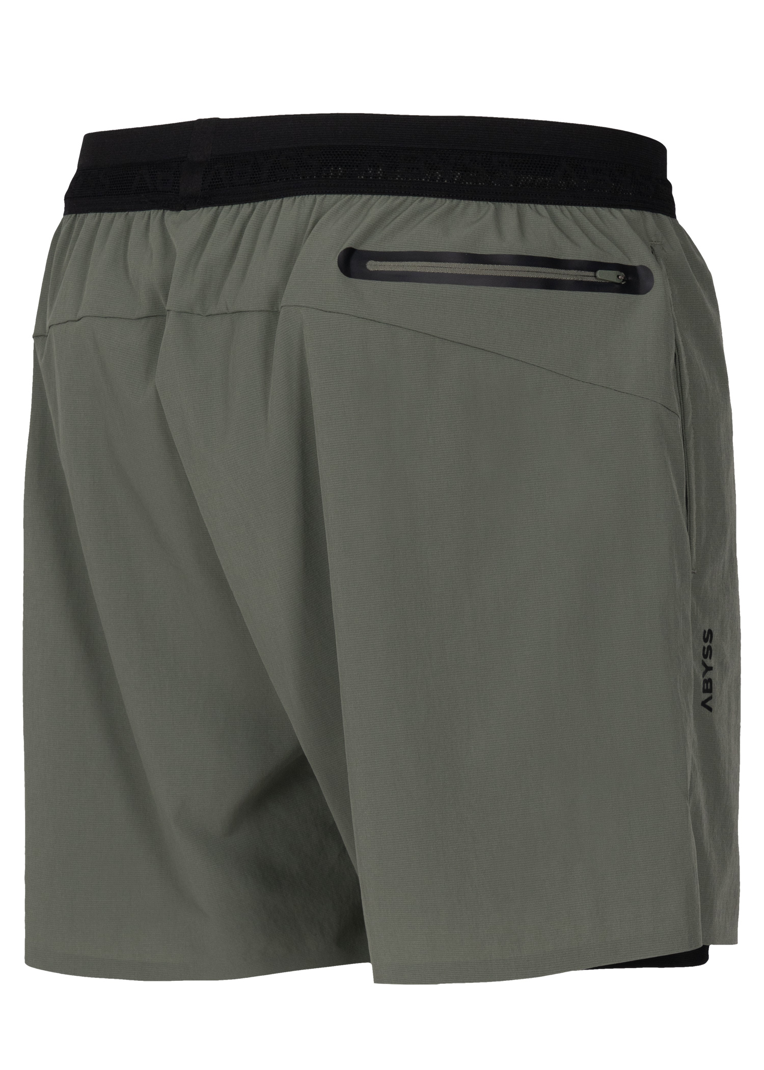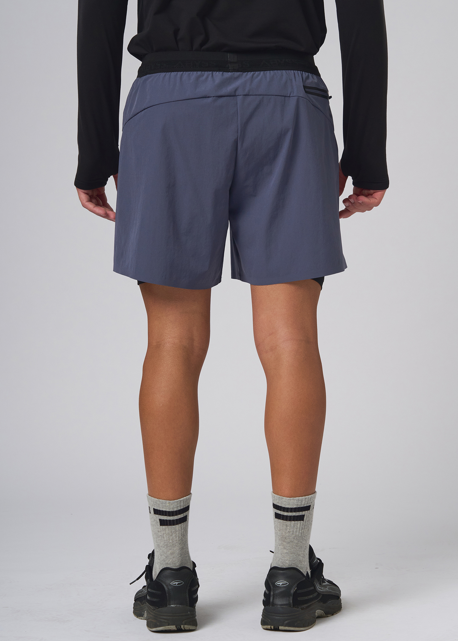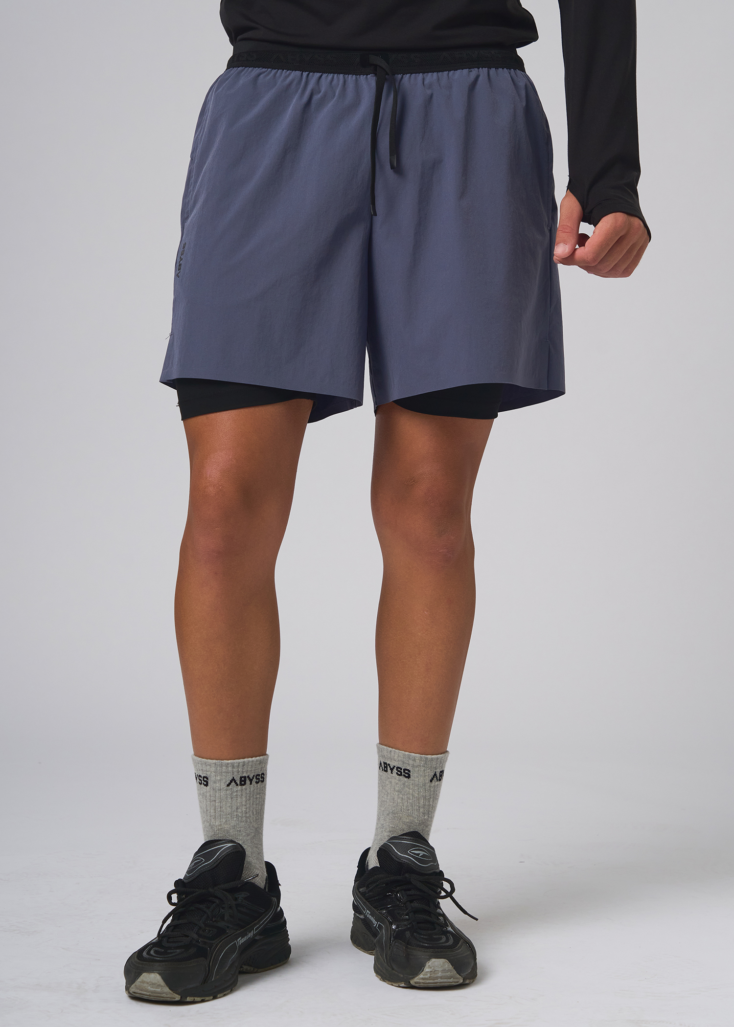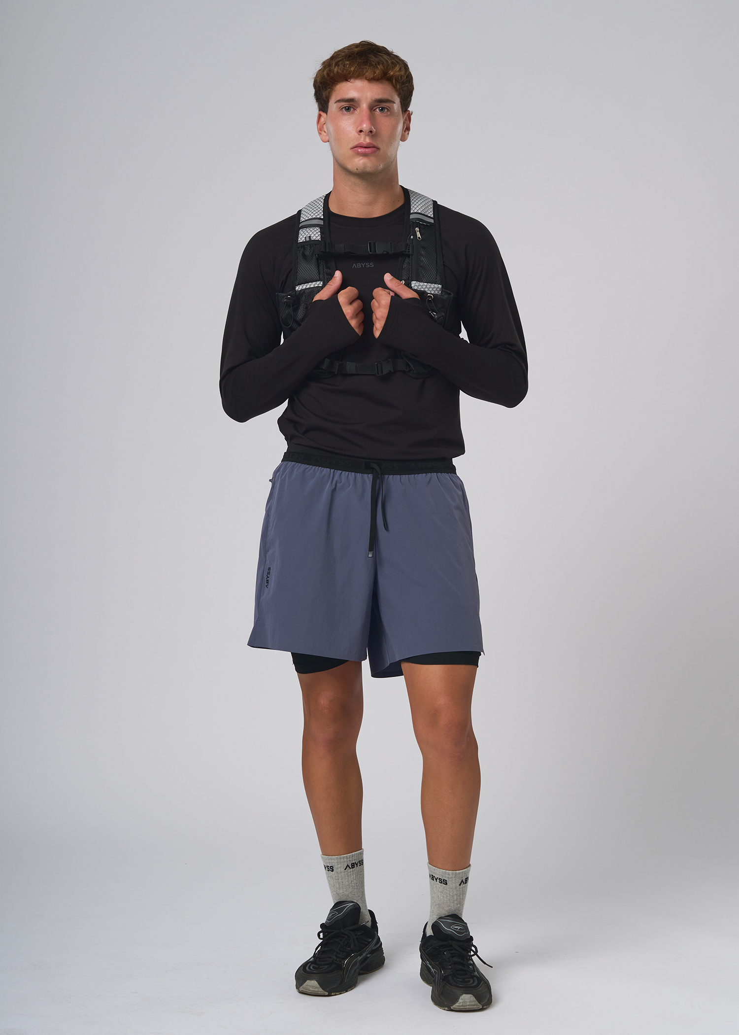 Nylon fantasia con spandex. Bermuda con elástico y cordón ajustable, bolsillos delanteros y trasero termosellado con cierre. Calza interna con silicona antideslizante en pierna. Logo termosellado.