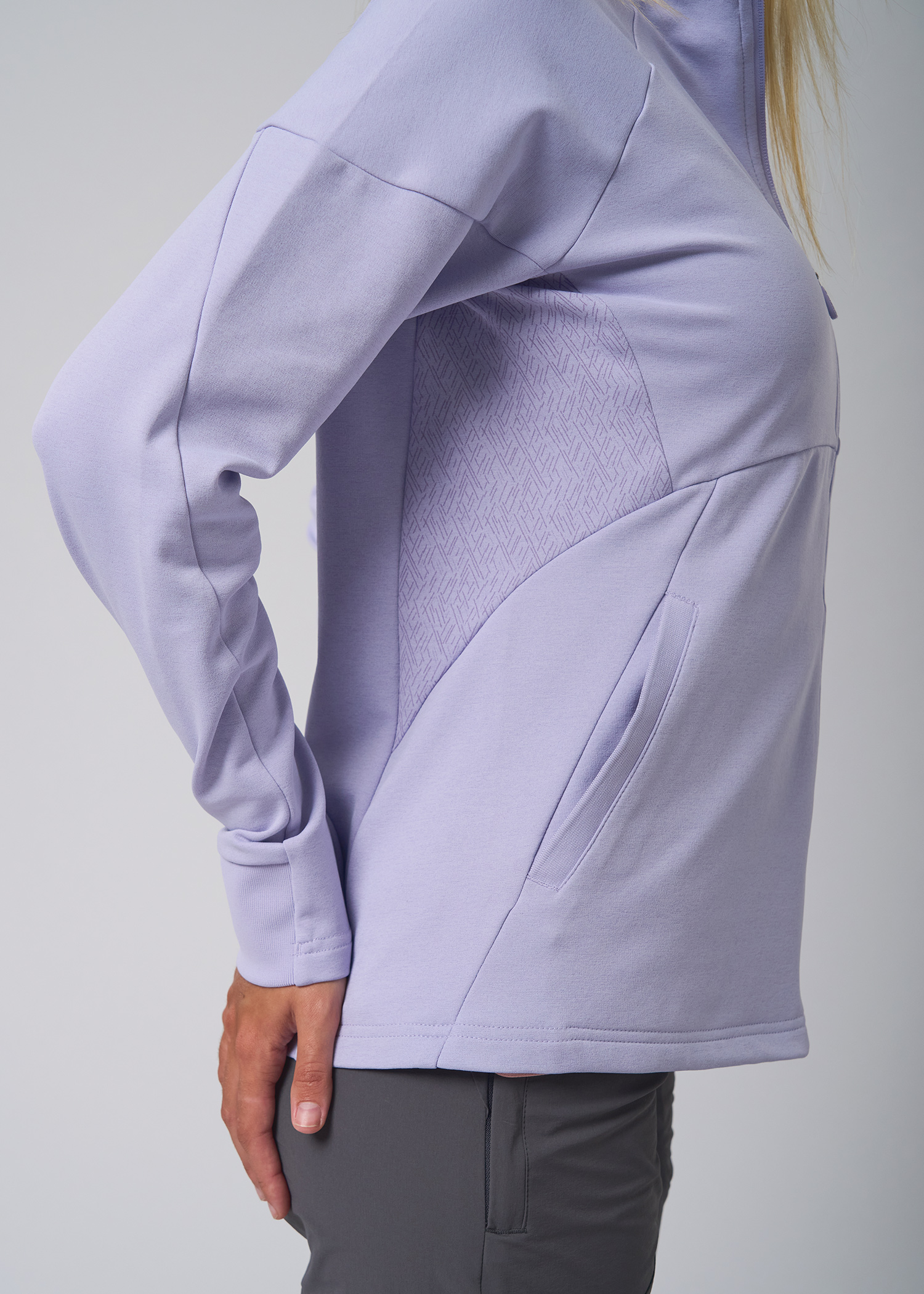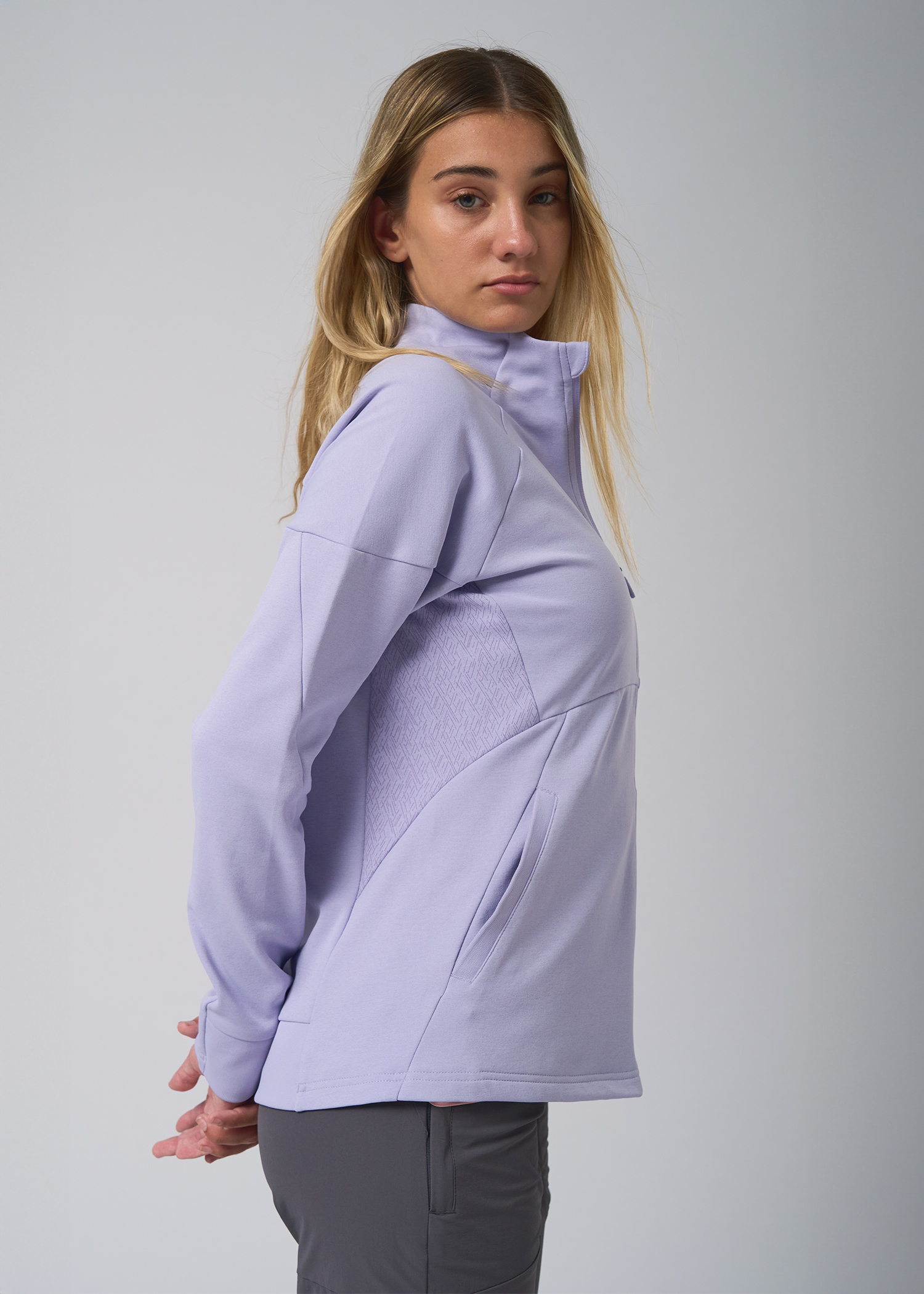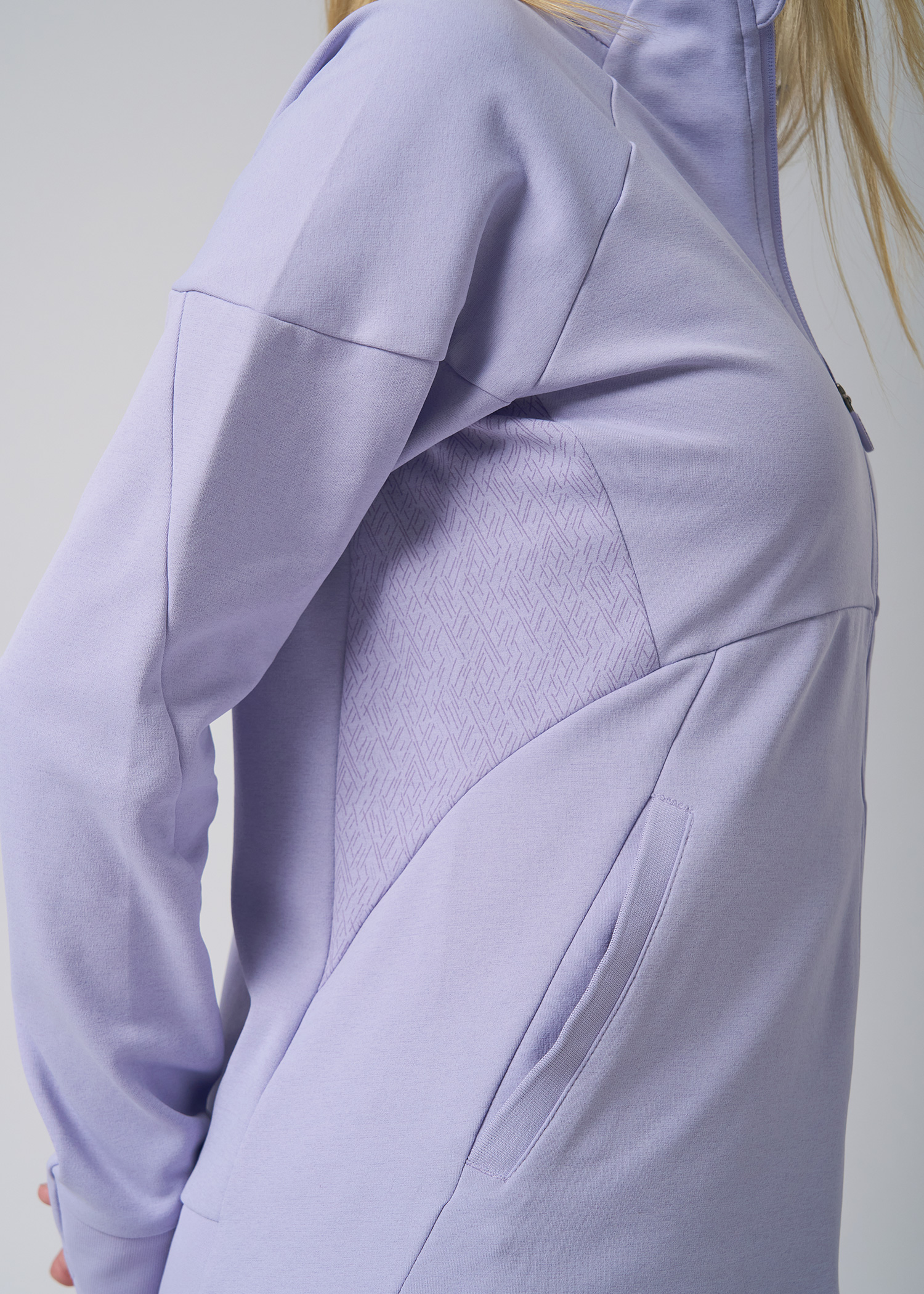 Deportivo frisado. Campera con laterales estampados engamados y bolsillos delanteros desde el recorte, trasero y mitad de puños con morley. Logos termosellados.