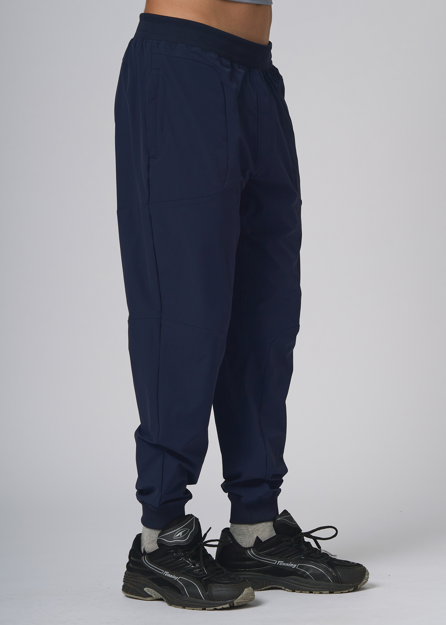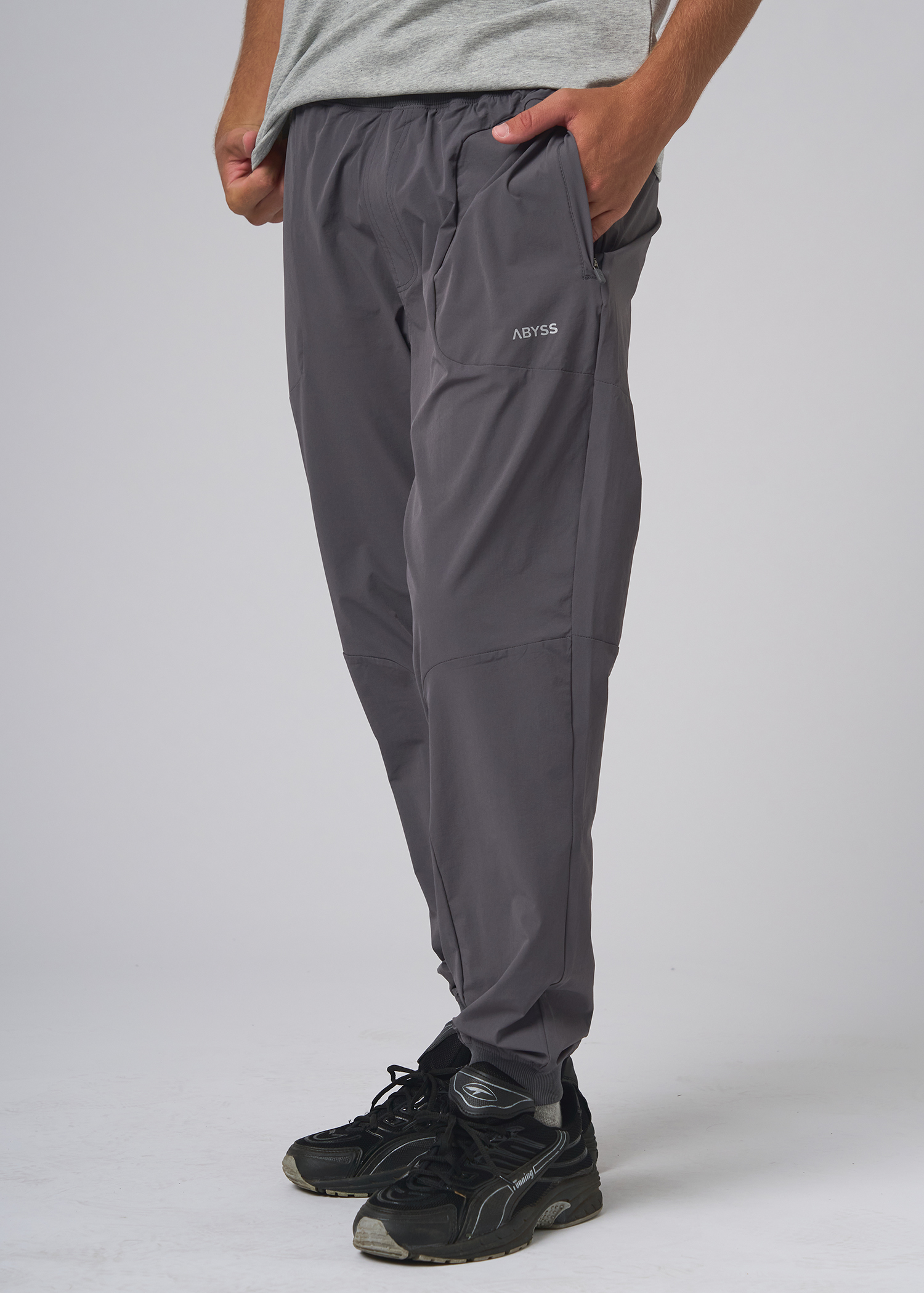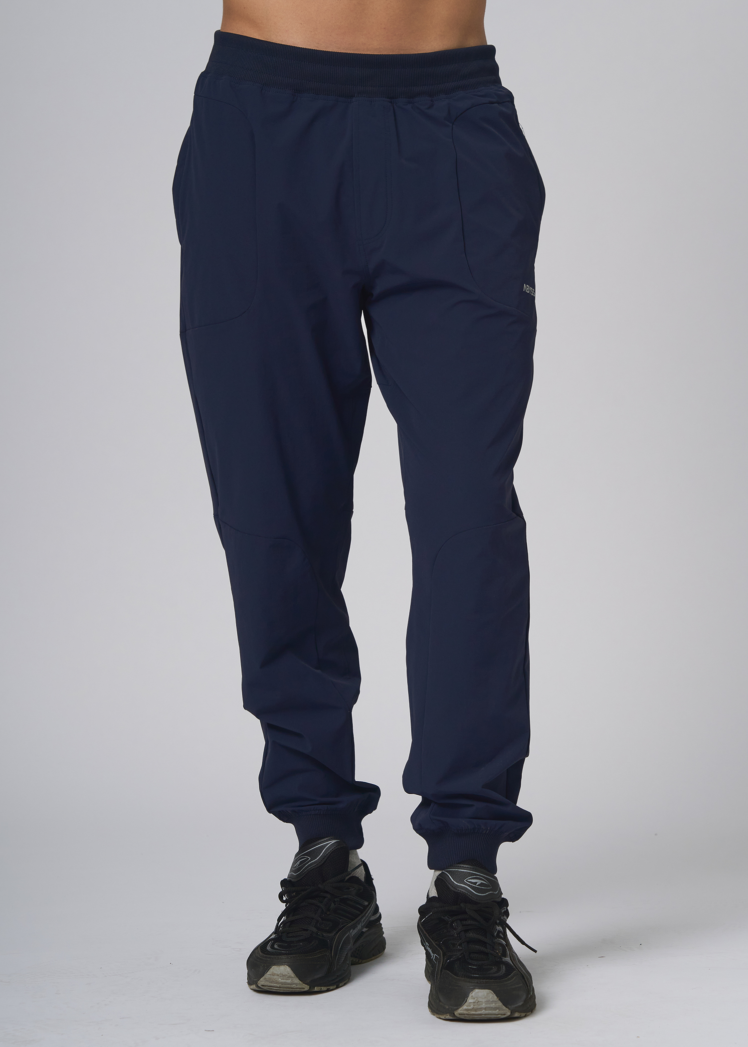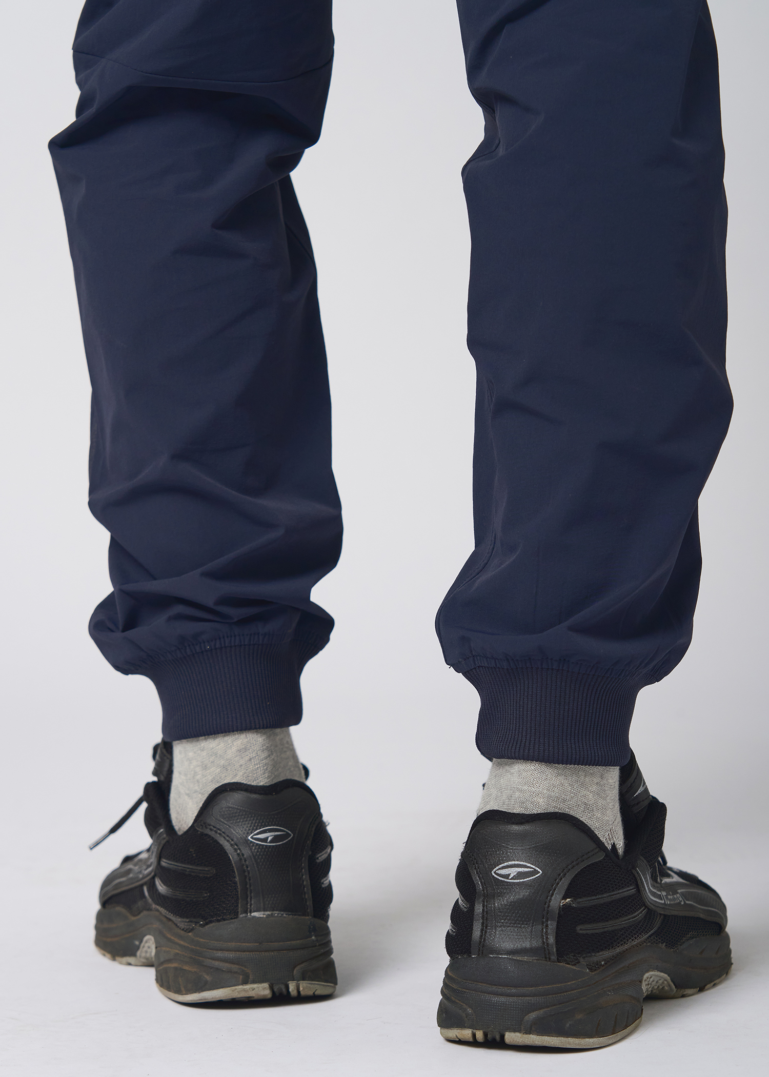 Nylon con spandex. Pantalón con puño en botamanga, bolsillos laterales con cierre y elástico en cintura. Logo termosellado en reflex.