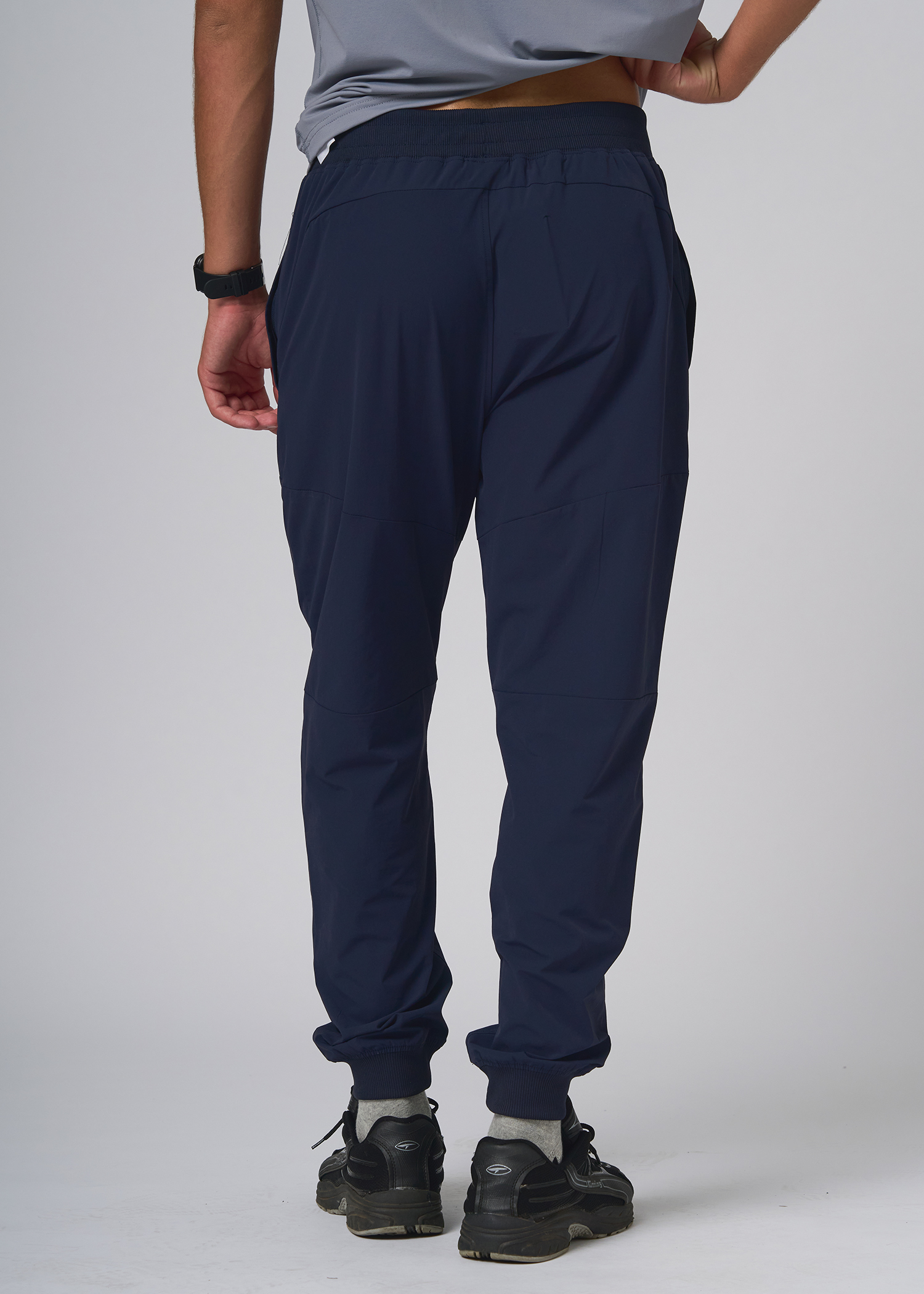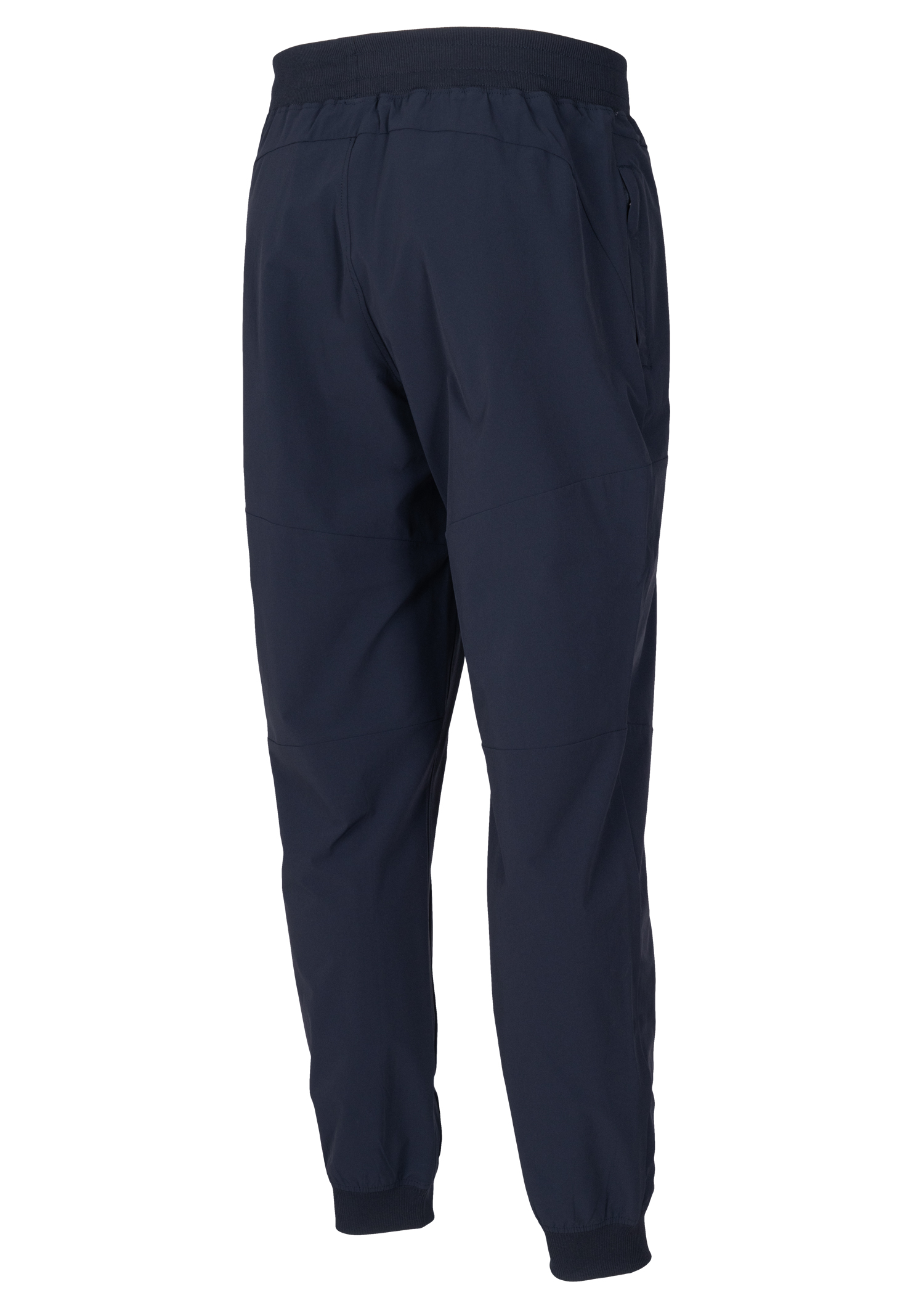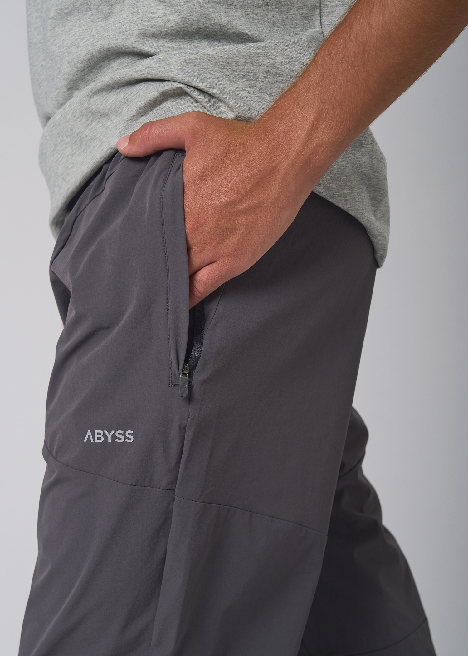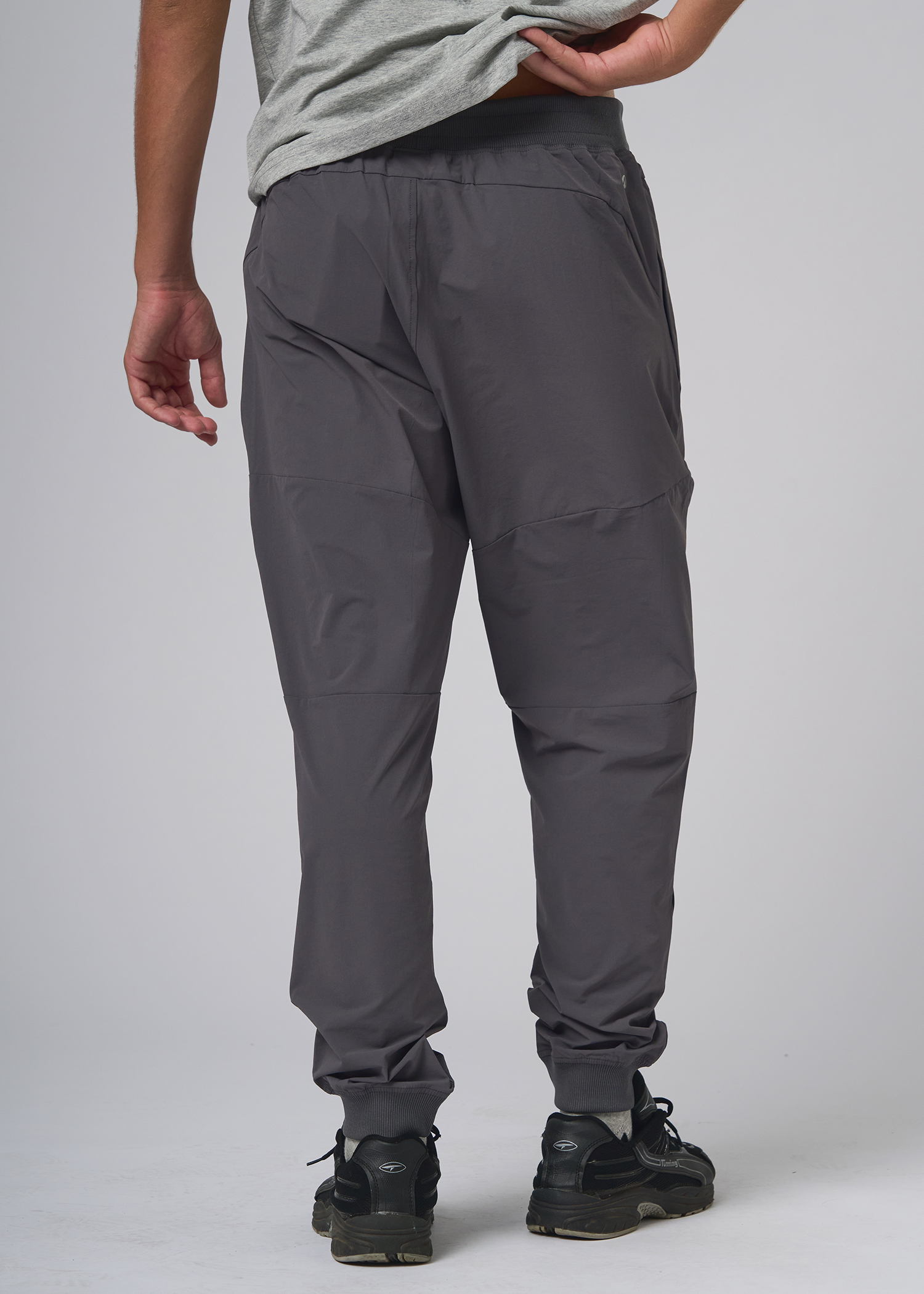 Nylon con spandex. Pantalón con puño en botamanga, bolsillos laterales con cierre y elástico en cintura. Logo termosellado en reflex.