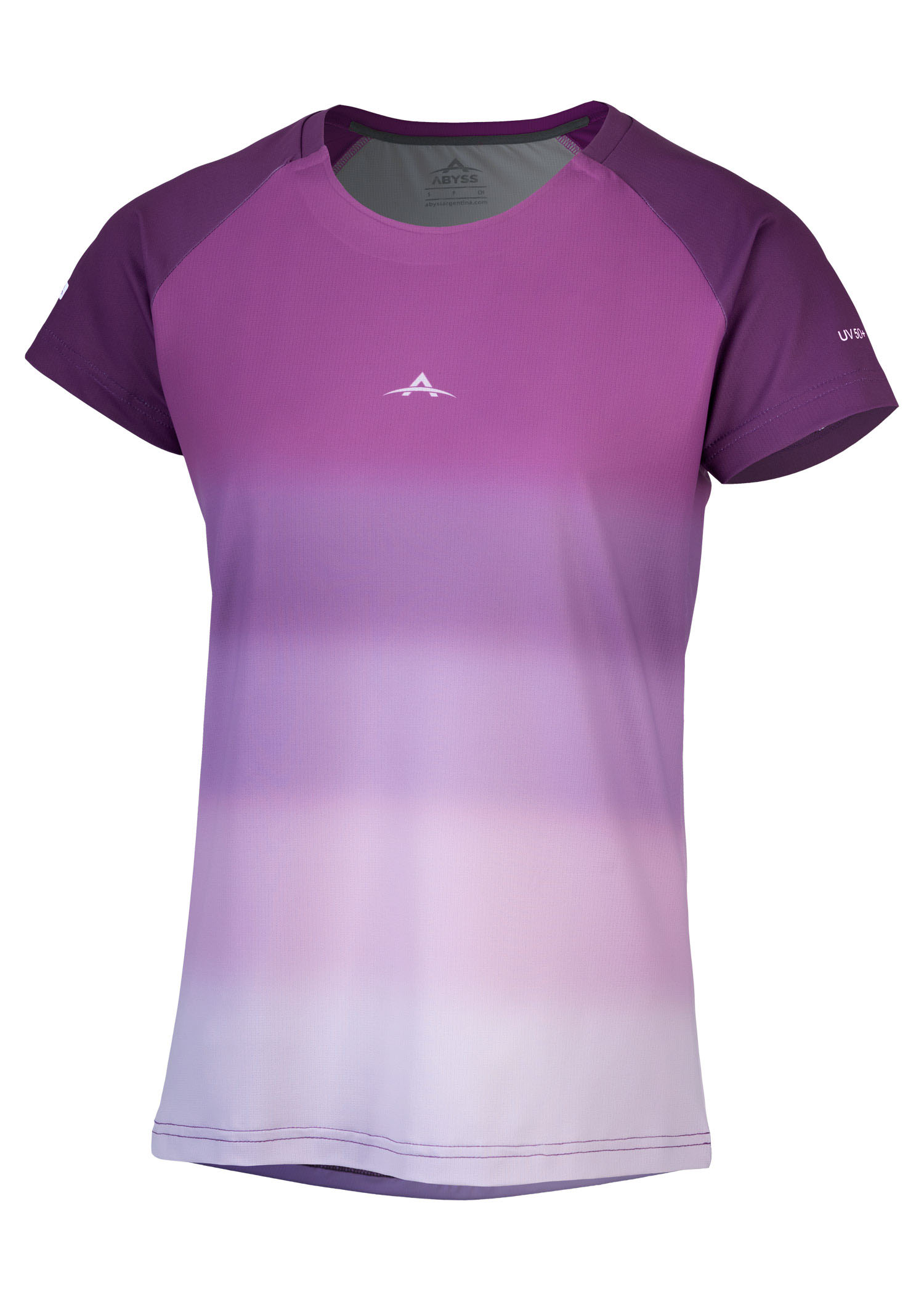 Microfibra con spandex. Remera manga corta ranglan, sublimada en degradé al tono. Cuello redondo termosellado. Tela con protección UV 50+. Logos termofijados.