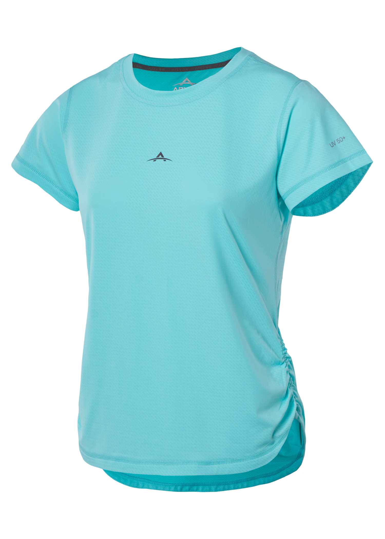Nylon fantasía con spandex. Remera manga corta con terminación curva en delantero y trasero, elástico cosido con detalle de frunces en laterales. Logo termosellado.