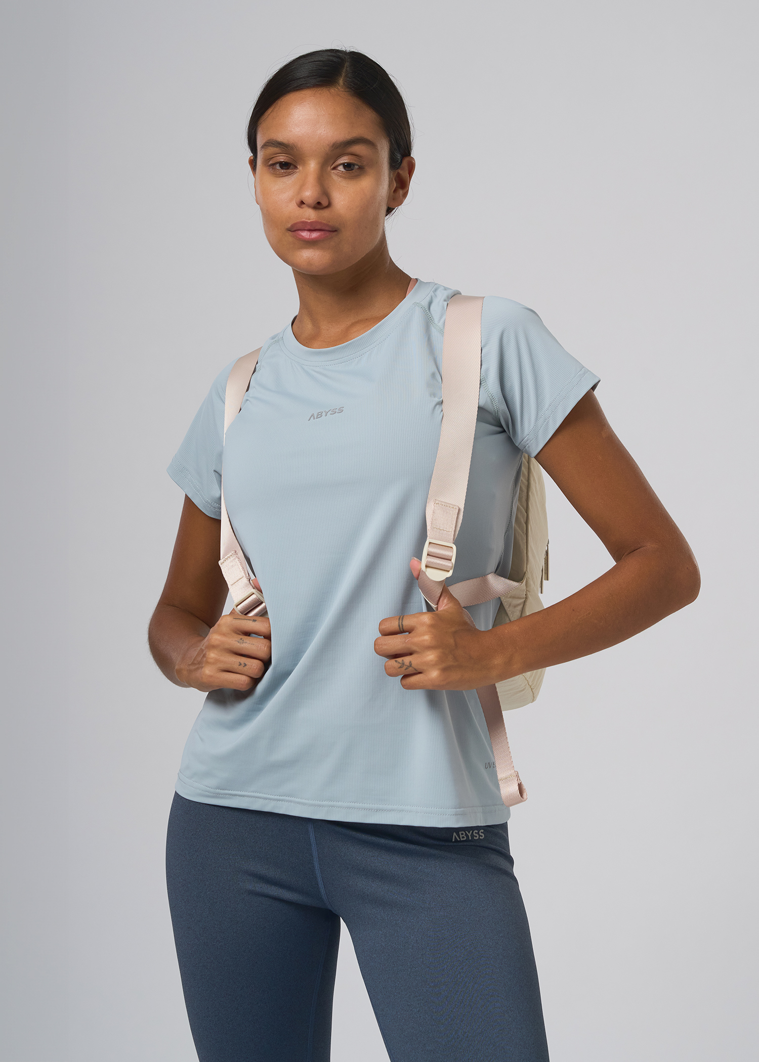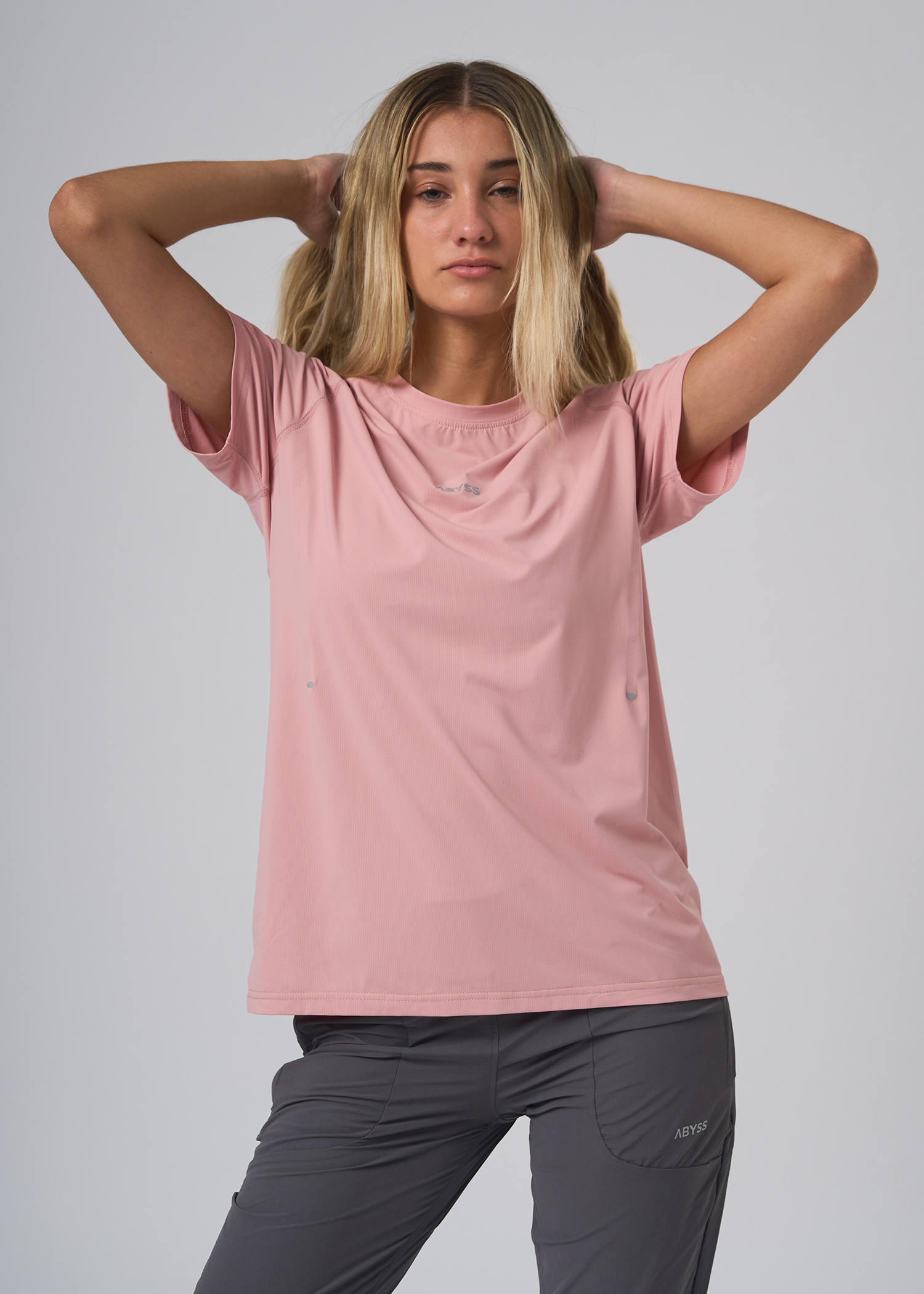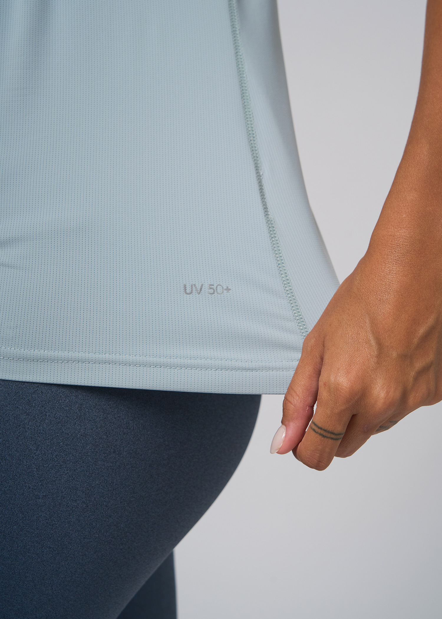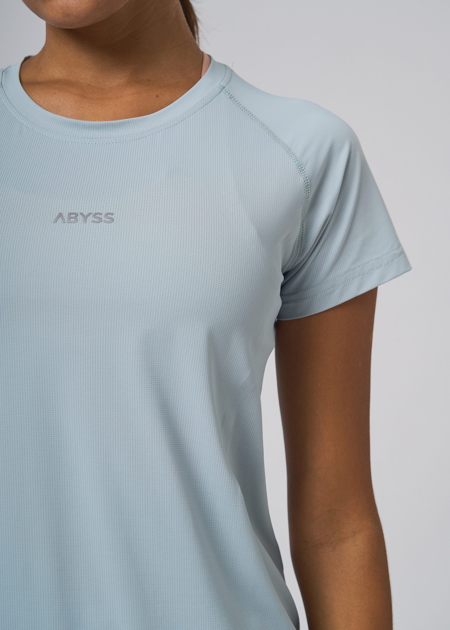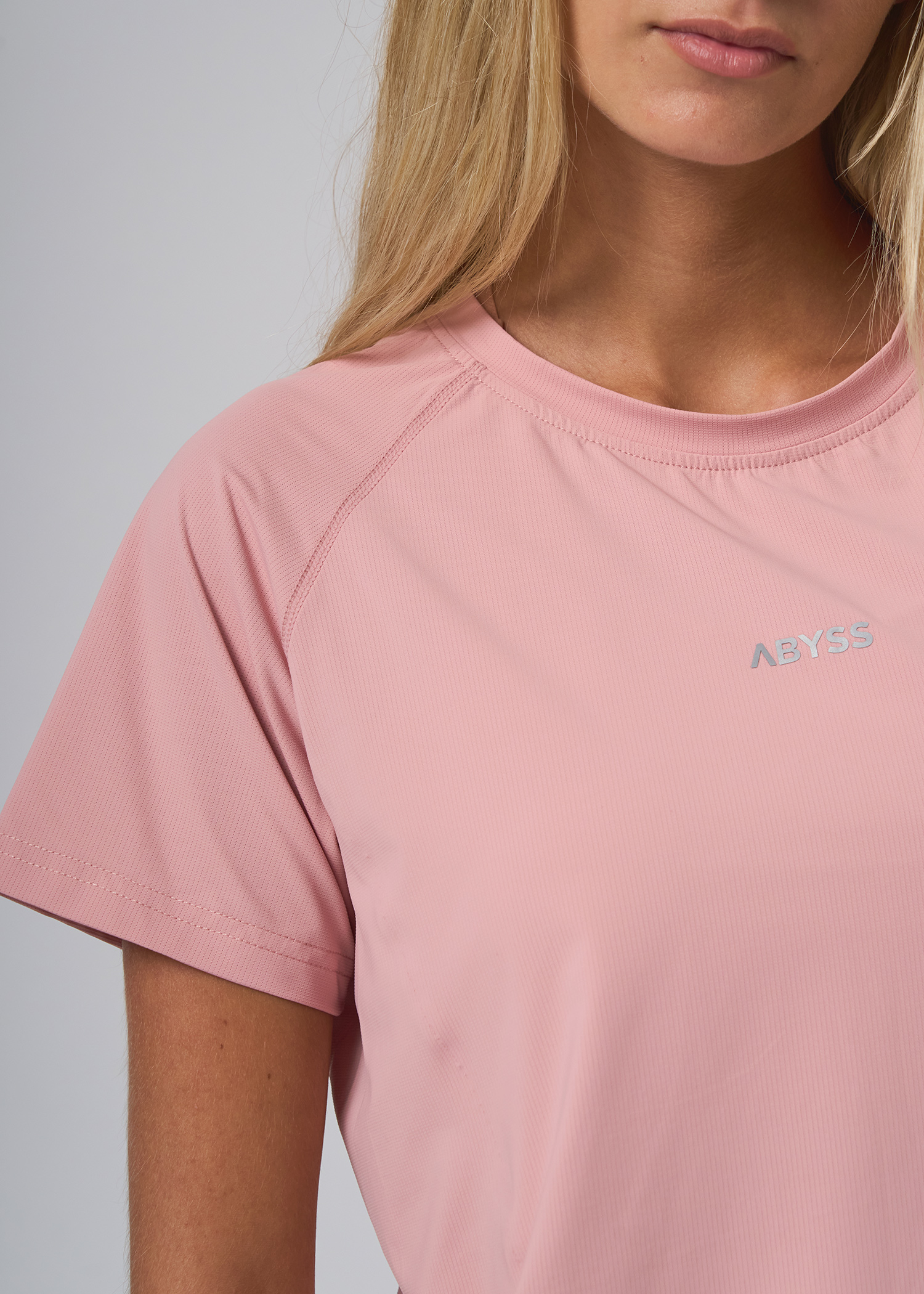 Nylon fantasia con spandex. Remera manga corta cuelloredondo con recortes delanteros termosellados con terminacion de reflex. Proteccion UV50+. Logo termosellado en reflex